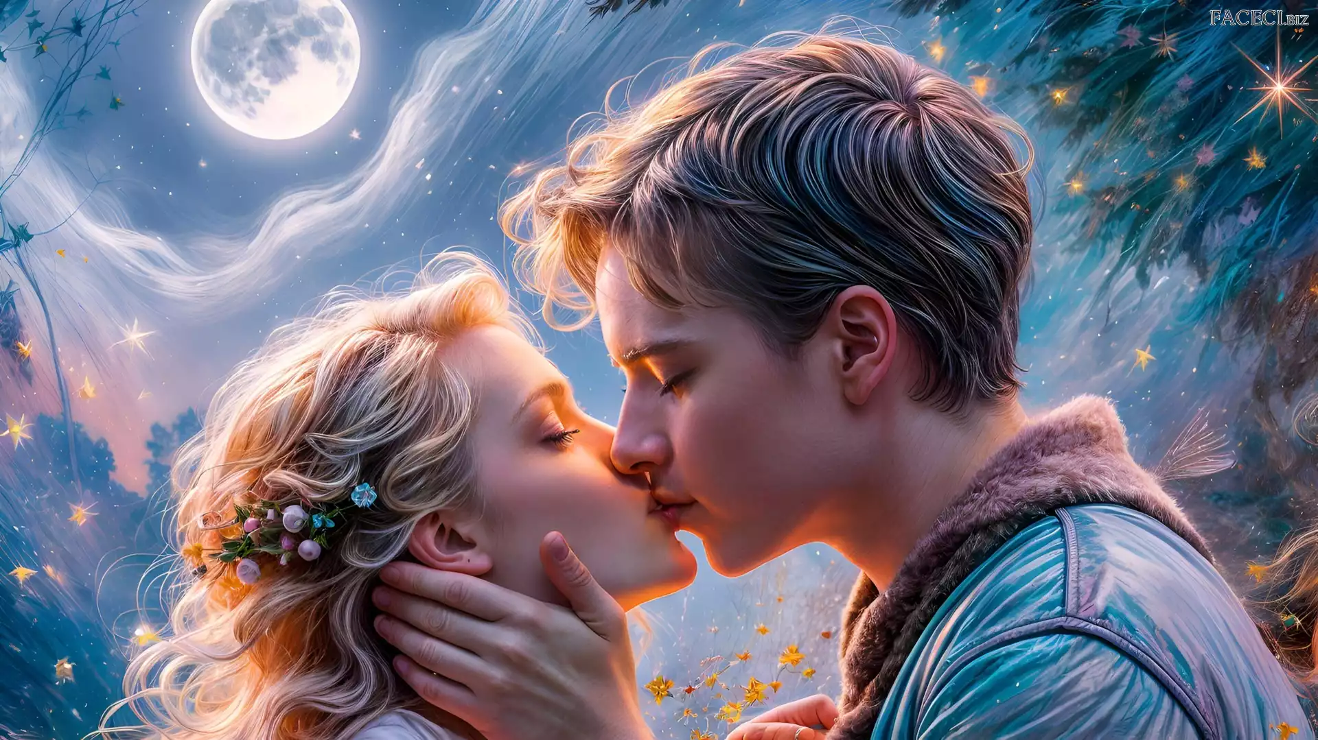 Kobieta, Księżyc, Mężczyzna, Para, Grafika, Zakochani, Pocałunek, Miłość - faceci.biz